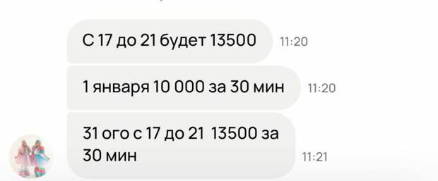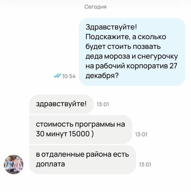 Today изучила предложения и узнала, что при заказе до 30 ноября агентства могут сделать скидку в тысячу рублей, но они все равно берут предоплату в 500 рублей.В объявлениях на «Авито» в среднем указаны цены от 8 тыс. рублей, но по факту вечеринка со сказочными персонажами будет стоить гораздо дороже. За корпоратив до 27 декабря просят от 19 980 до 24 980 рублей. Такие деньги аниматоры берут за полчаса выступления. Уже с 28 декабря цена вырастет до 24-34 тыс. рублей.