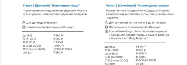 Дешевле стоит организация праздника для ребенка или детей на дому. До 19 декабря 20-минутная программа обойдется в 7 тыс. рублей, с 19 по 28 – 9 990 рублей, в новогоднюю ночь Дед Мороз и Снегурочка будут готовы прийти и подарить подарок ребенку за 15-17 тыс. рублей.