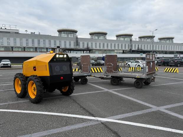 Желто-оранжевый робот начал перевозить багаж пассажиров в петербургском аэропорту Пулково. Испытания беспилотного тягача продлятся полгода.