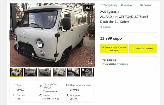 На немецком рынке появился редкий экземпляр легендарного российского внедорожника УАЗ-3741 («Буханка») выпуска 2024 года. Автомобиль предлагается покупателям за 22 999 евро, что соответствует приблизительно 2,1 миллиону рублей по нынешнему обменному курсу.