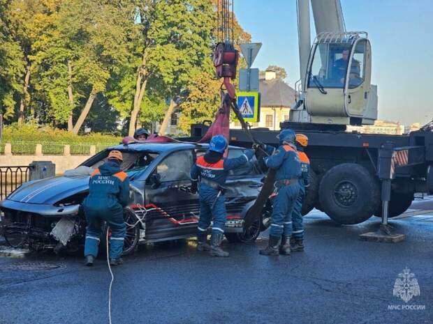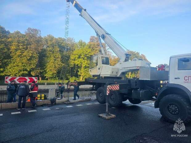 МЧС показало, как специалисты доставали легковой автомобиль Porsche Cayenne из Фонтанки. Машина пробила ограждение набережной и упала в воду. Погибла женщина.