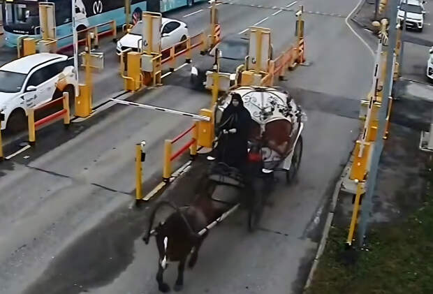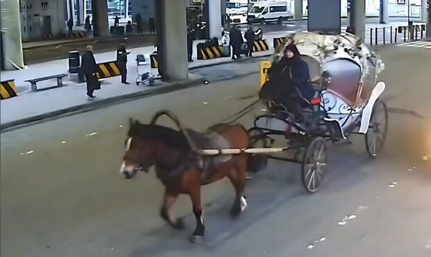 Путешественники заметили в Пулково карету с черной лошадью после перехода аэропорта на зимний тариф парковки. Колесница передвигается по дорогам вместе с автомобилями.